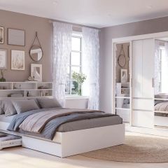 В комплект входит: кровать, внизу которой расположены вместительный угловой шкаф (полки и штанга), стеллаж для книг и компьютерный стол с дополнительным столиком.