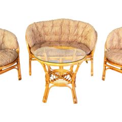 Комплект из натурального ротанга, состоящий из дивана, двух кресел и круглого столика со стеклом.